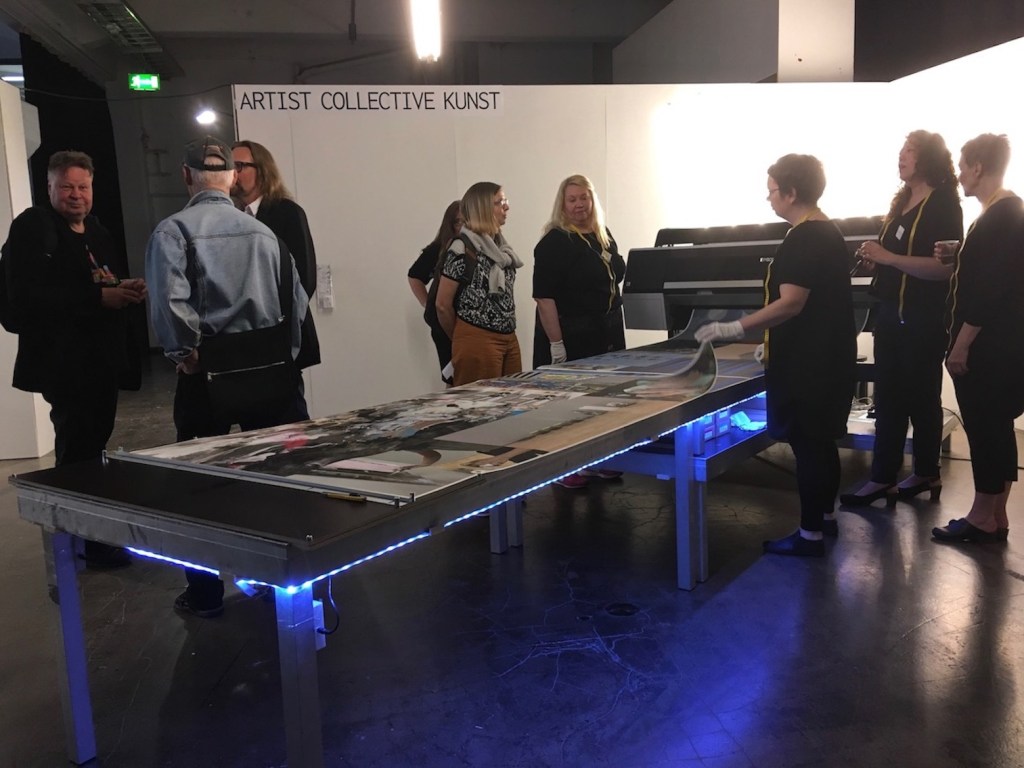 Art by Meter is an art installation and a social sculpture by Artist Collective Kunst in Art Fair Suomi Festival for Contemporary Art in Cable Factory in May 2019. Art by Meter is a collective installation and a social sculpture where art is sold by meter. Carnivalistic work comments on value of art and artists´ work as well as art being subject of trading and investments.