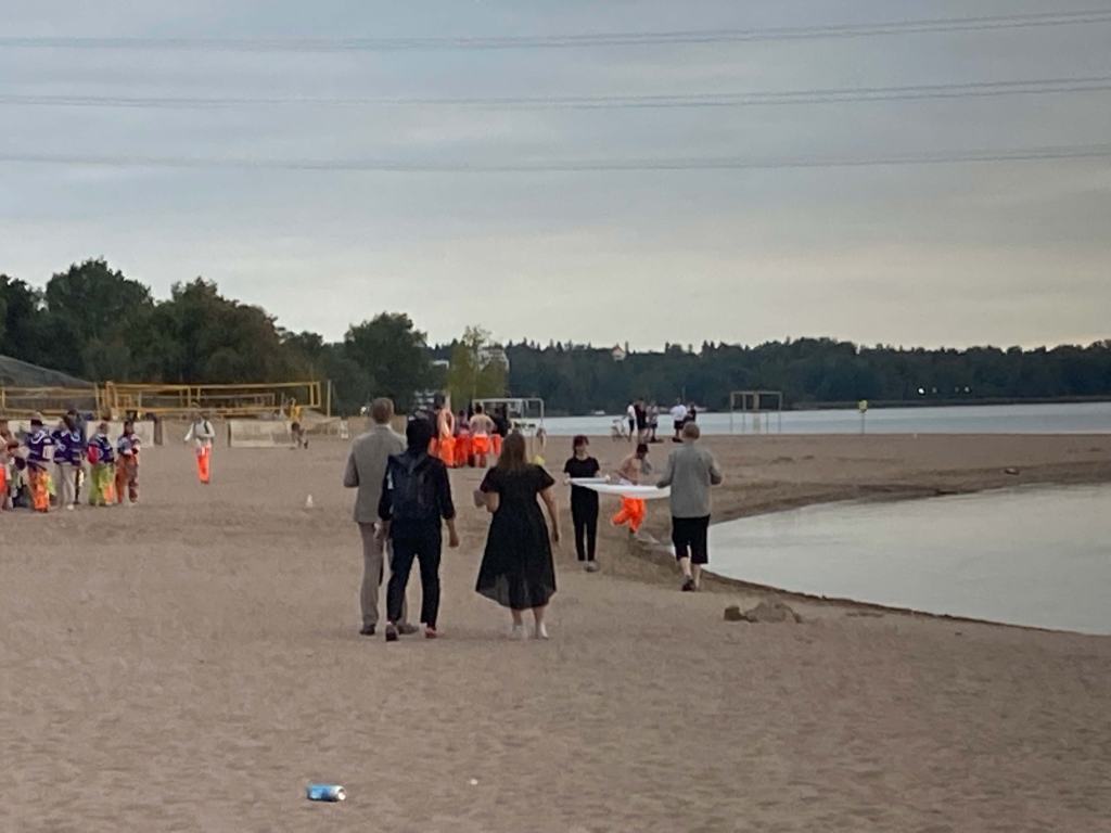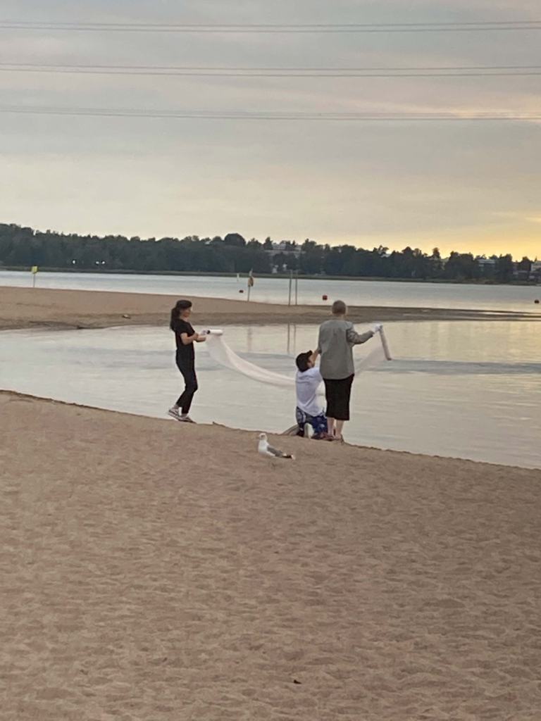 KATKOVIIVA RANNASSA KLO 20 – DOTTED LINE AT SHORELINE AT 8 p.m / Salla Myllylä ja Mia Seppälä / performanssi Hietsun uimarannalla elokuussa 2022 (60 min.) / Performance at Hietaniemi beach in the evening at sunset in August 2022 (60 min.)