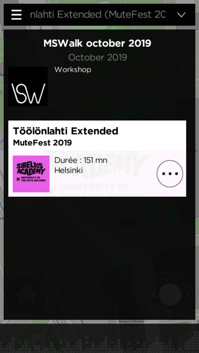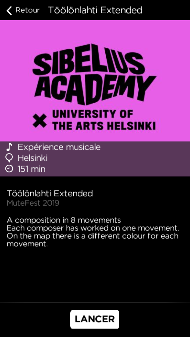 Making use of GPS technology, this sonic walk offers listeners a new perspective on the area around Töölönlahti bay. Listeners download an app, put on headphones and walk around Töölönlahti bay, hearing music created specifically for the walk by music technology students at the Sibelius Academy.