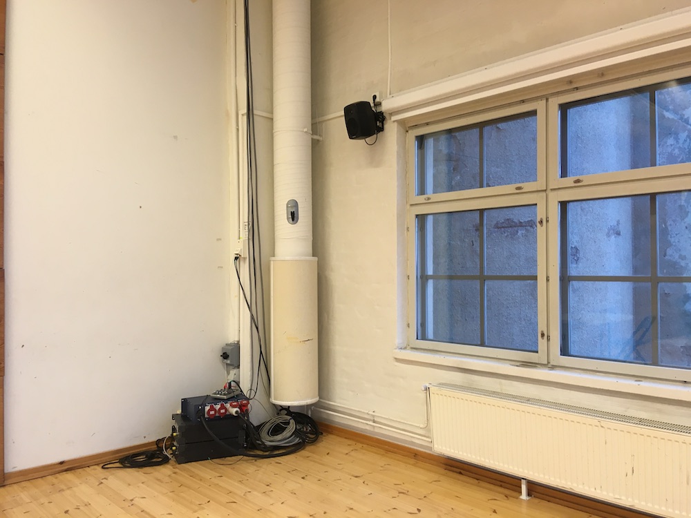 An unusual use of sound technology in the exhibition space, where the speakers suggest imagining a soundscape for the view from the window. Space: “Majakka”, Academy of Fine Arts building (Mylly).