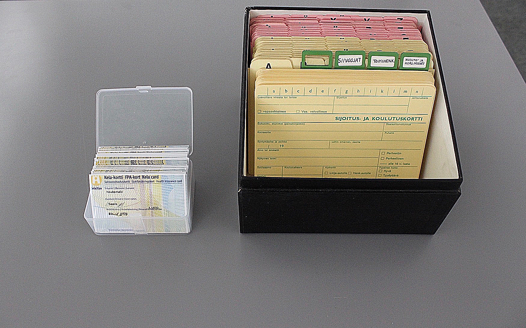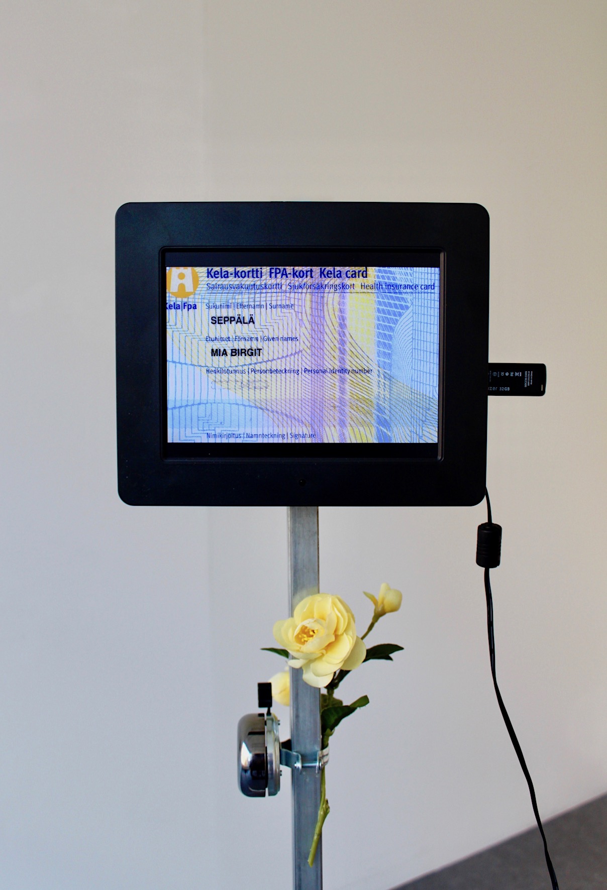 KELA CARD (KELAKORTTI) is a kind of guarantee of the Finnish identity. It seemed sufficiently recognizable object, through which could get to reflect on how national identity can be defined. I scanned my Kela- card and emptied of its personal information and replaced missing information to the information of some database, which the encoding program began to draw at randomly. These names and social security numbers combinations does not “really” existed.